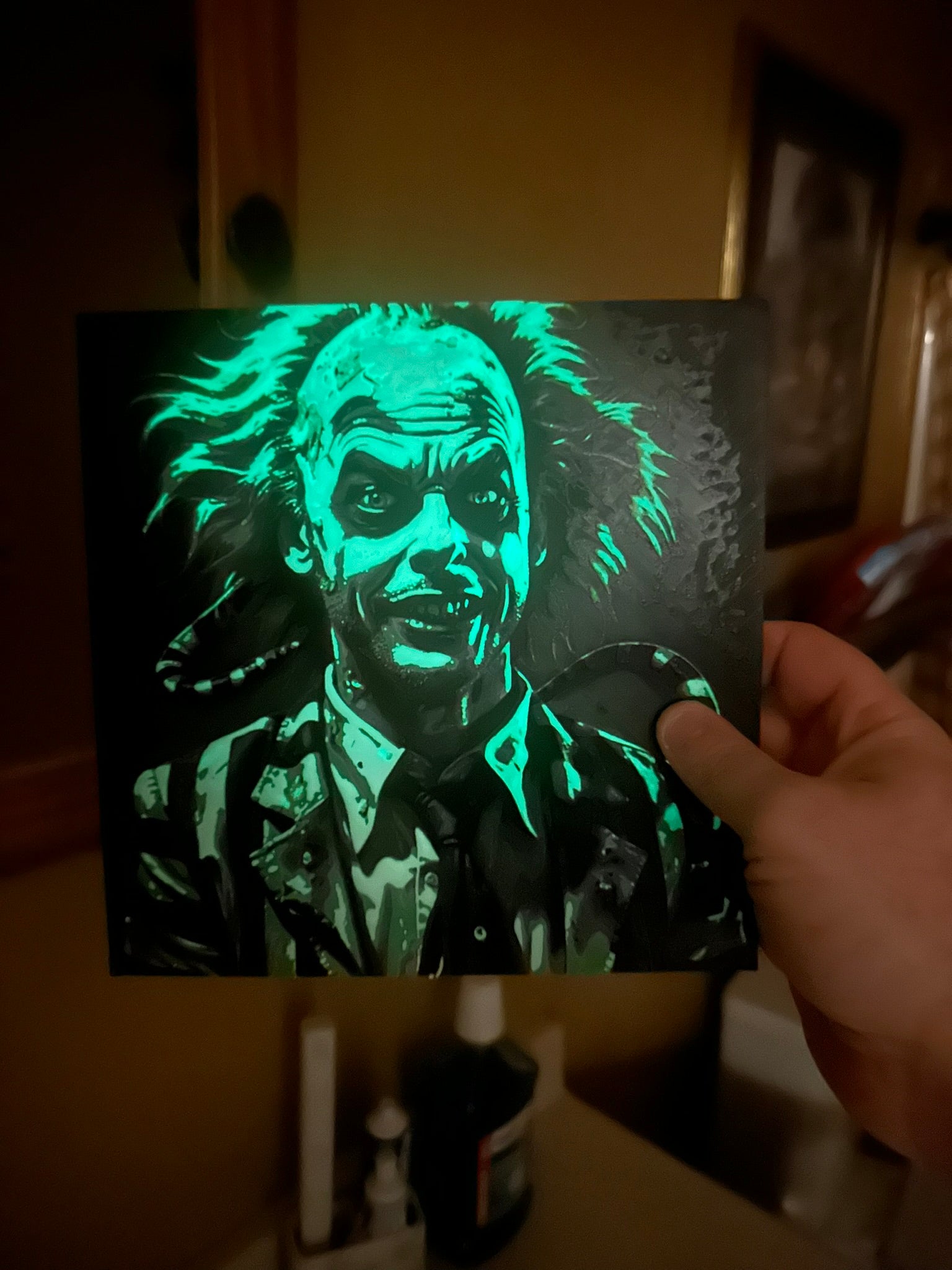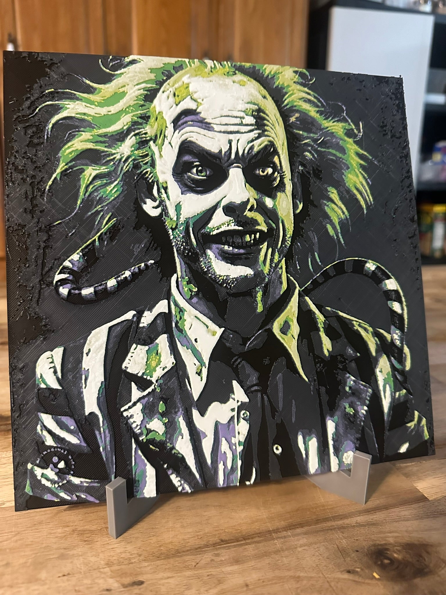 Straight outta the neitherworld a homage to everyone’s favorite freelance phantom. Crafted in detailed layers including with his signature stripes, that unruly hair, his smug grin, and . We bring you this classic film favorite in glorious textured layers—and yes..... he glows in the dark.