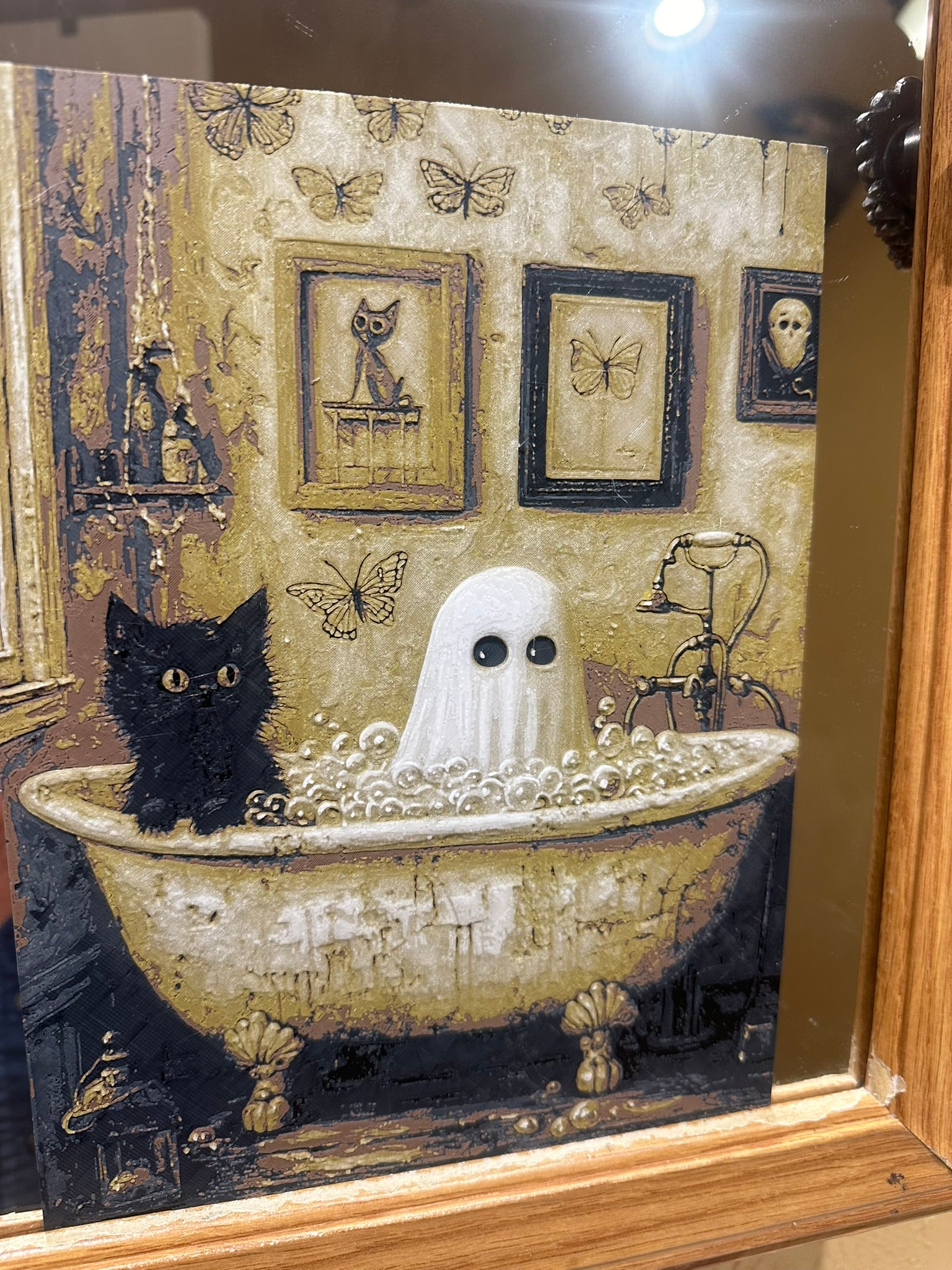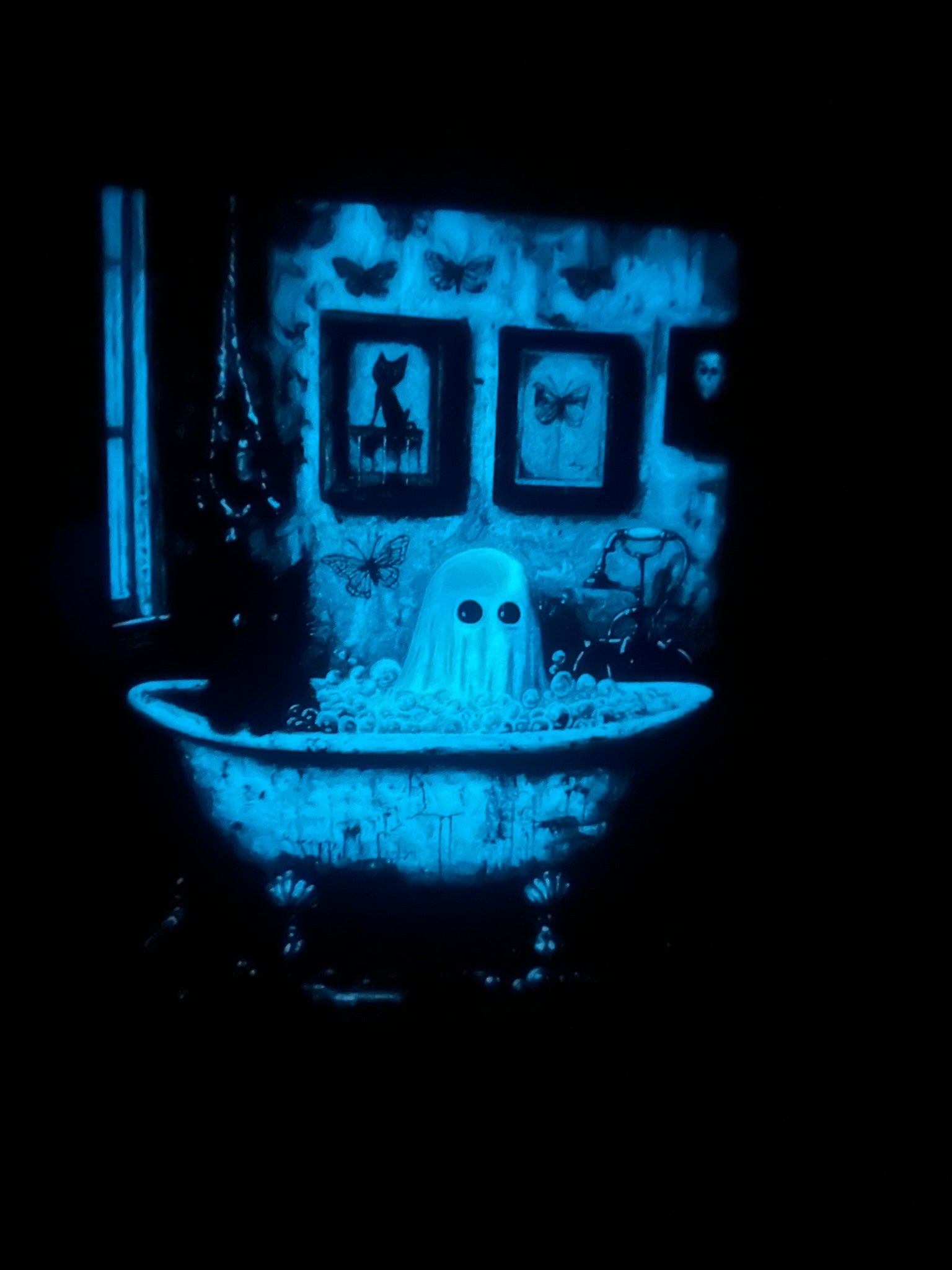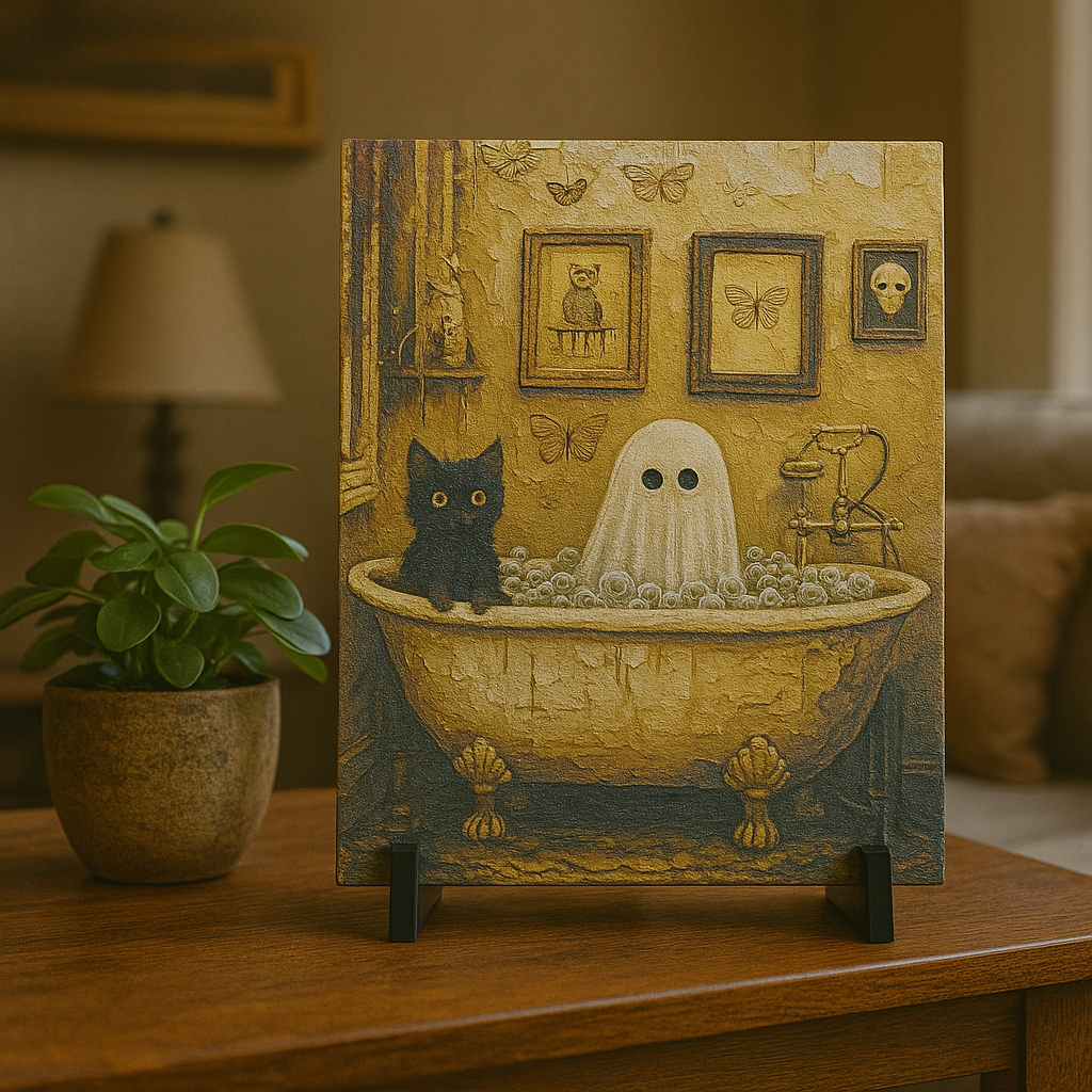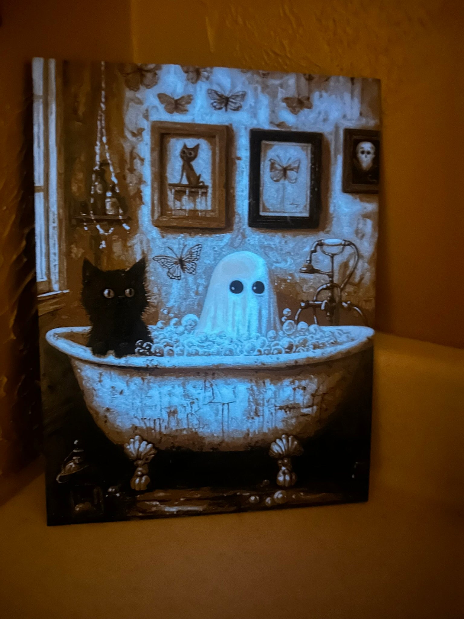 “Boo & Bubbles” is a gothic-cottagecore delight! Where a content 👻 soaks in suds, a black cat stands guard, and the entire scene glows gently when darkness falls.