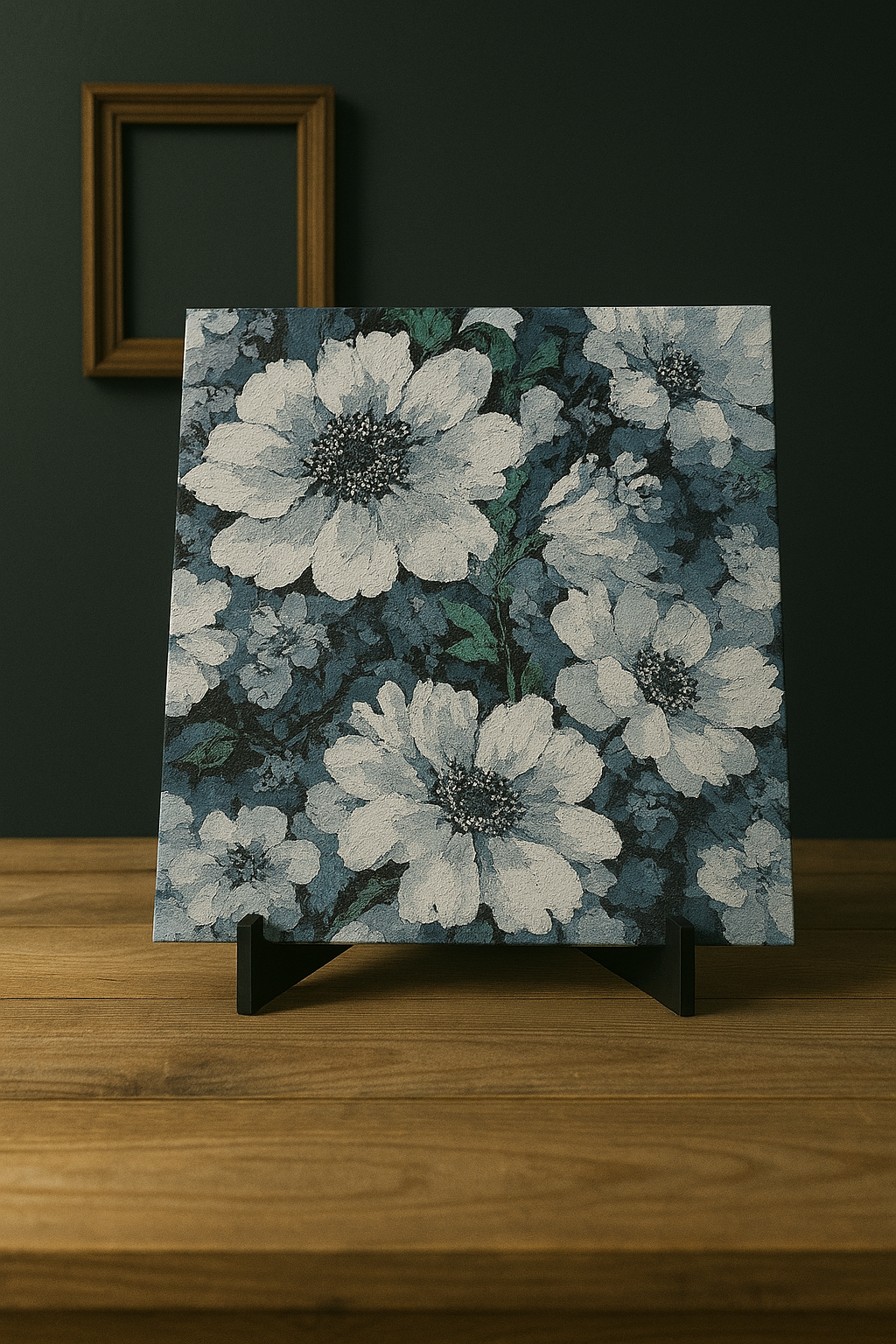 Step into a twilight garden with “Midnight Magnolias,” a captivating floral piece where delicate white blooms drift through a moody ocean of deep blues and subtle greens. Every petal is etched with texture and emotion, brought to life through high-resolution 3D printing that adds dimension you can feel.