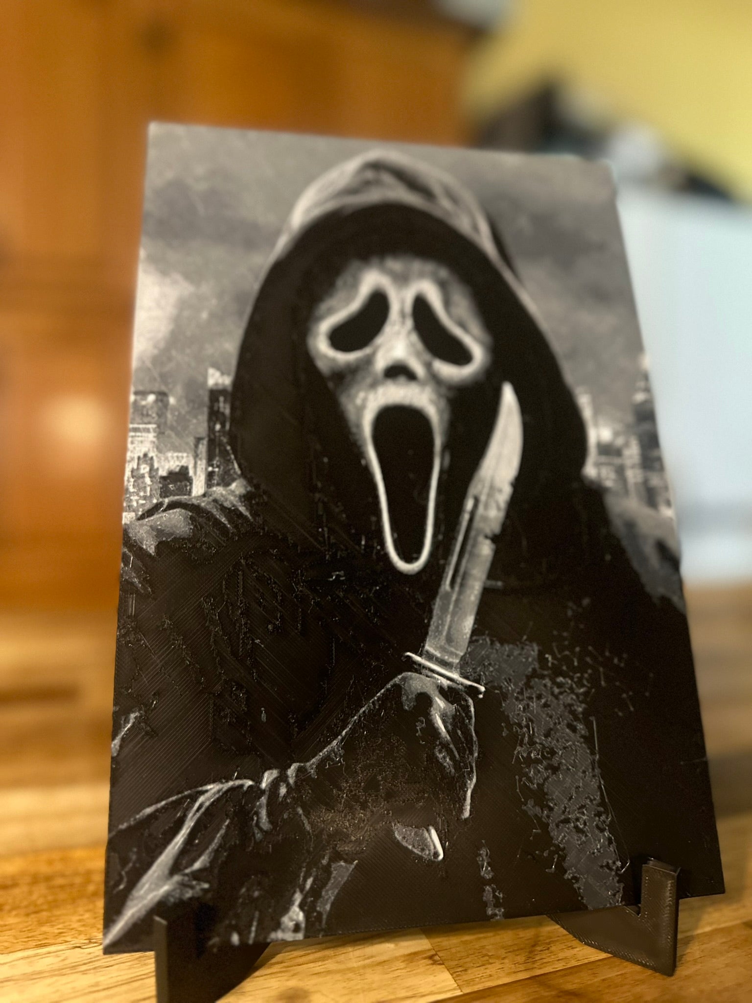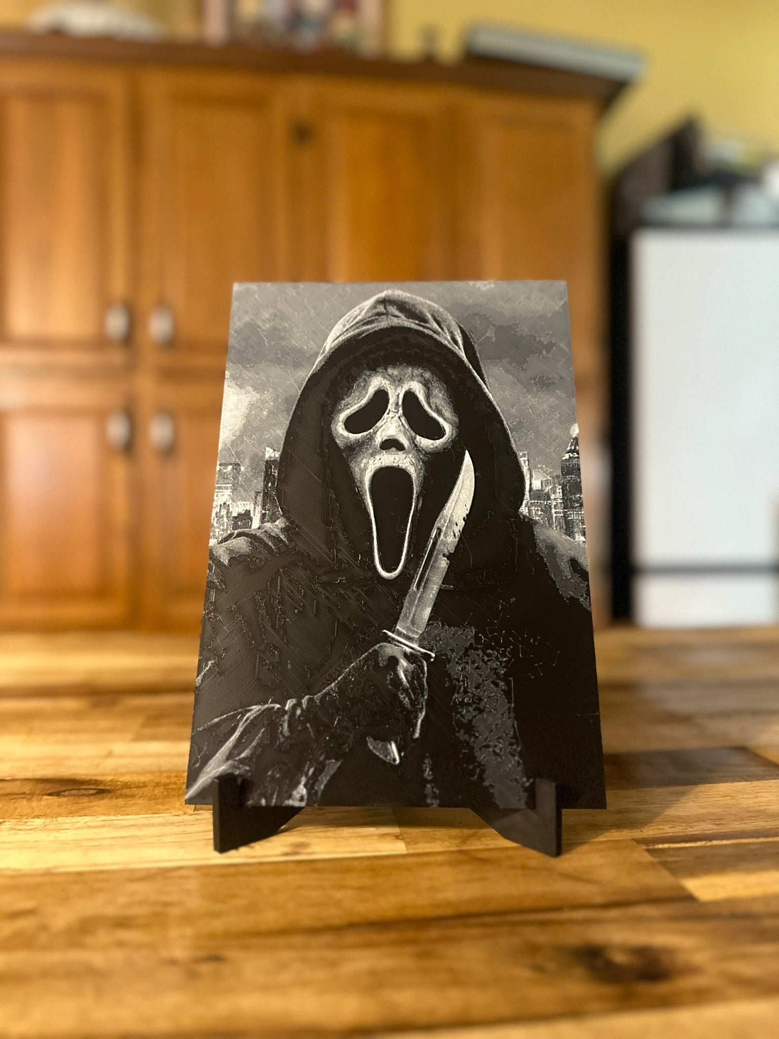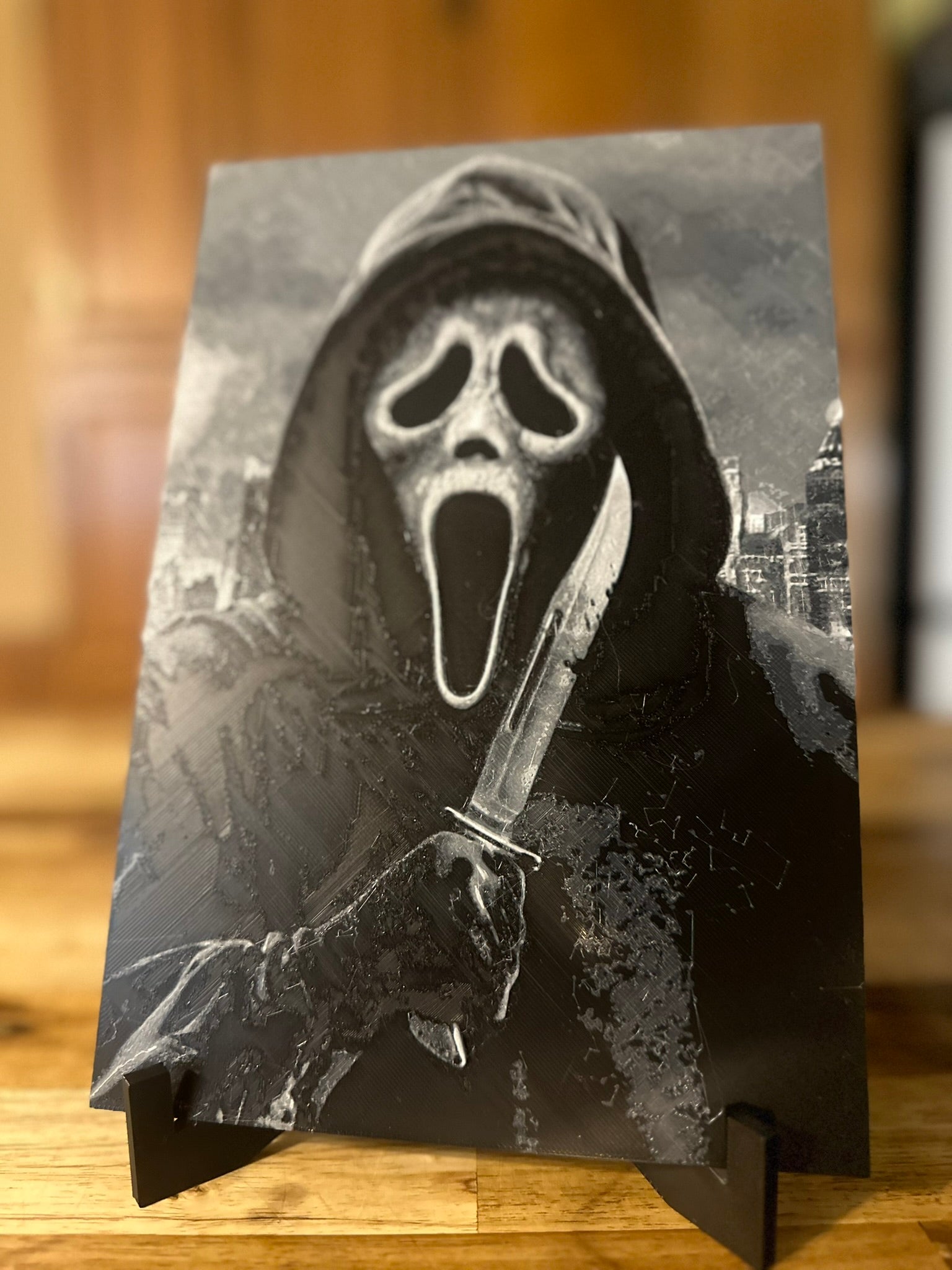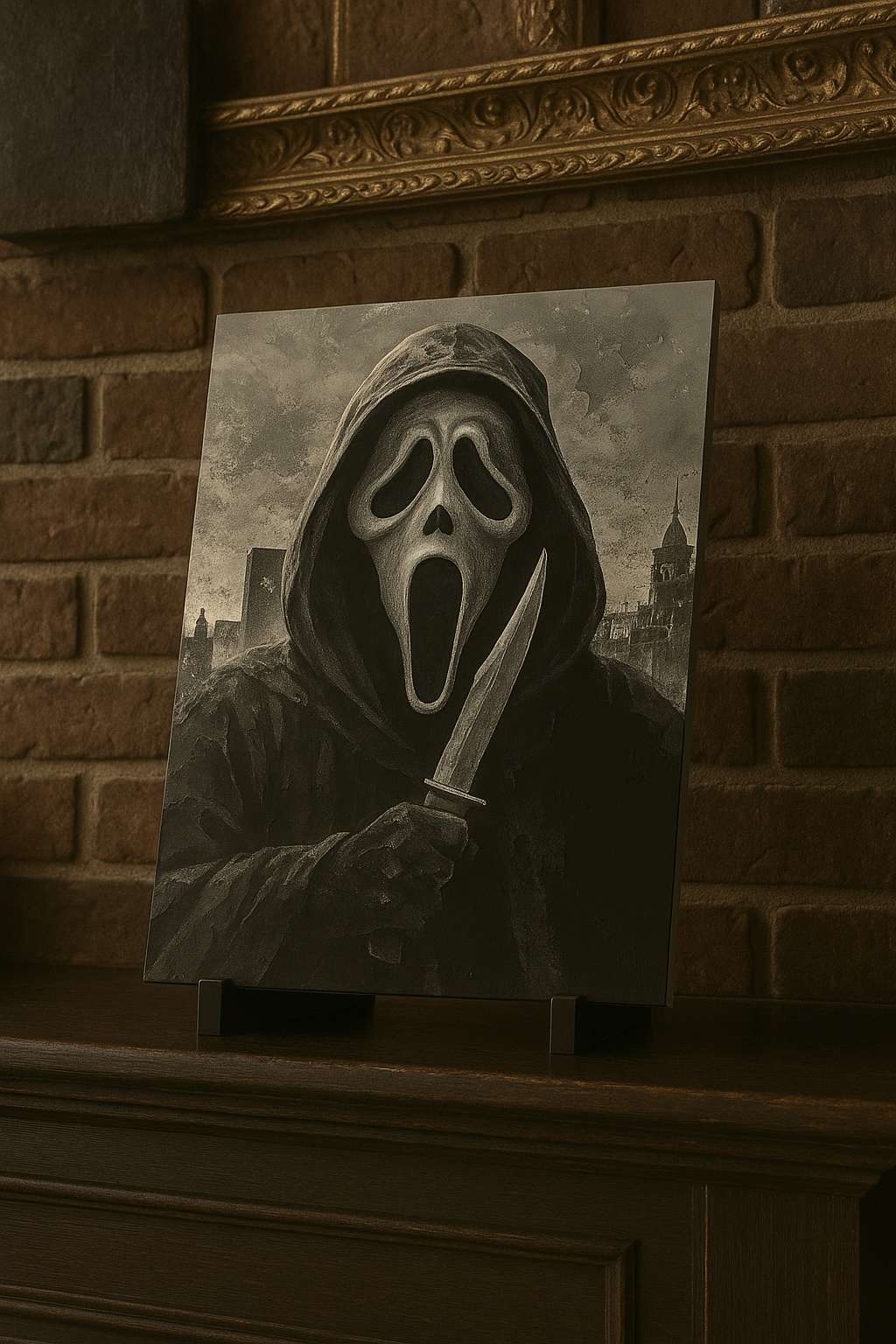 Add a touch of thrilling suspense to your space with “Silent Scream,” a hauntingly elegant depiction of the iconic masked figure, Ghostface. Set against a brooding city skyline, this 3D printed piece masterfully balances menace and mystery—capturing the pulse of classic horror with the poise of modern fine art.